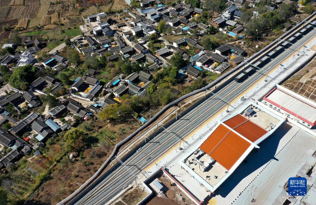 11月25日拍攝的麗香鐵路拉市海站,鐵路旁是麗江納西族民居(無(wú)人機照片)。