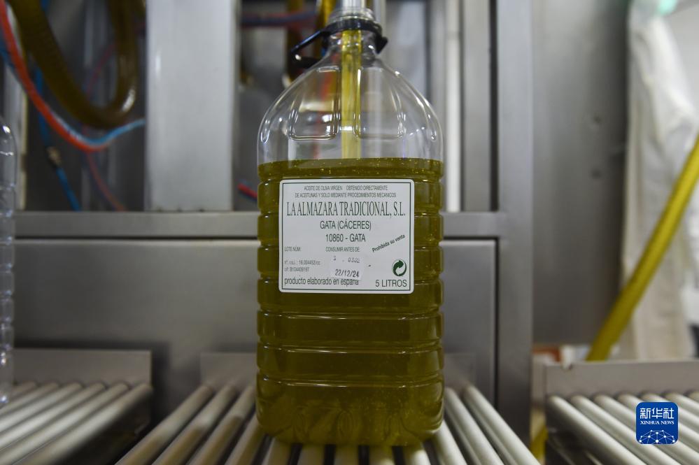 這是11月24日在西班牙卡塞雷斯的一處橄欖油工廠(chǎng)拍攝的橄欖油。