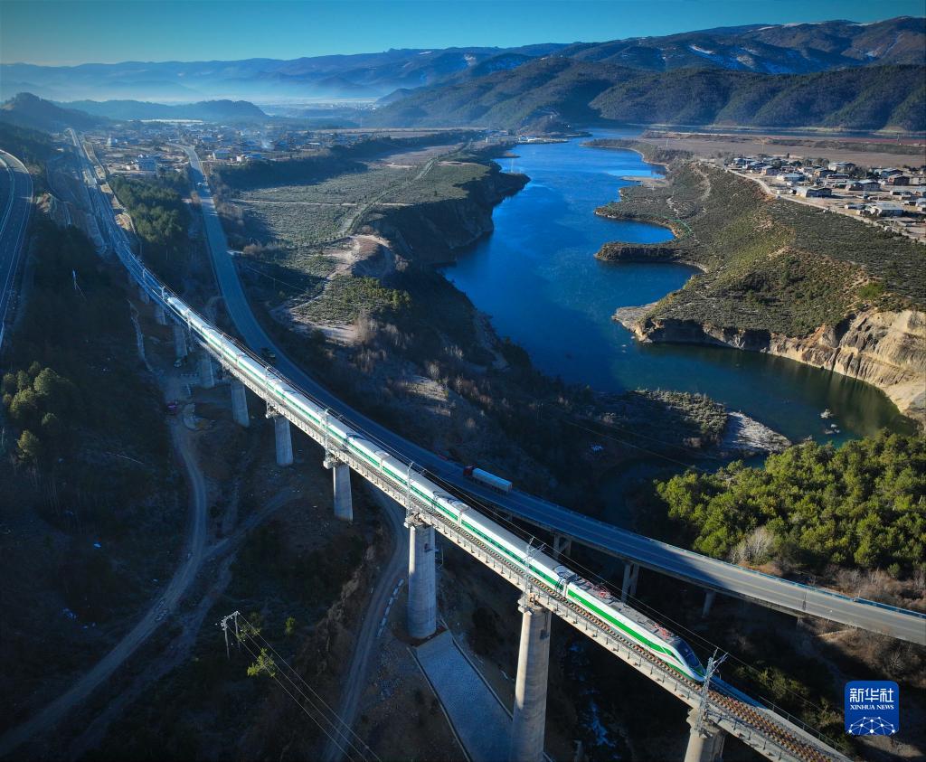 11月26日,列車(chē)行駛在麗香鐵路線(xiàn)上(無(wú)人機照片)。