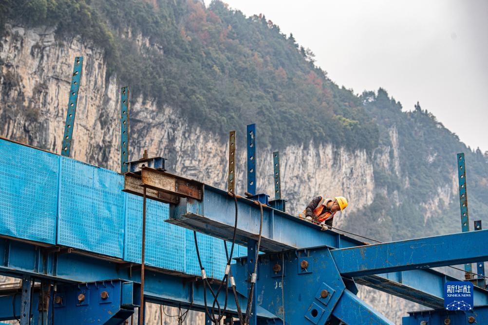 11月26日,在位于重慶市酉陽(yáng)土家族苗族自治縣龔灘鎮的阿蓬江大橋施工建設現場(chǎng),工人正在現場(chǎng)作業(yè)。