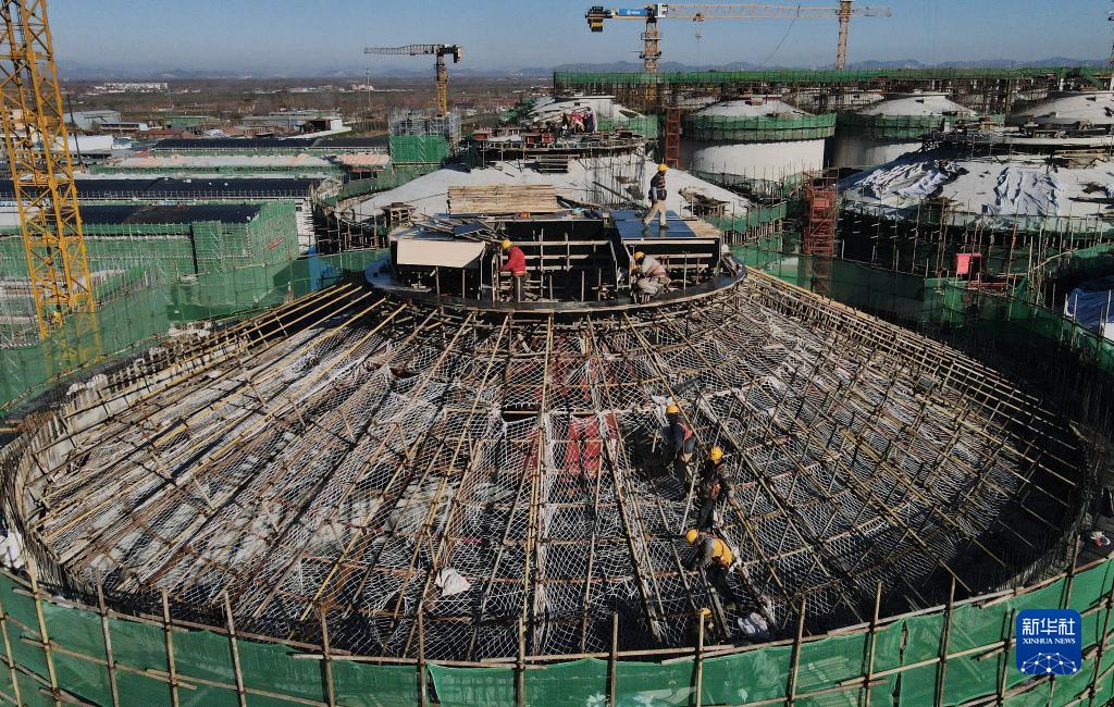 11月26日,工人在河北省唐山市豐潤區糧食安全應急儲備及食品深加工全鏈化綜合生產(chǎn)基地項目建設工地施工(無(wú)人機照片)。