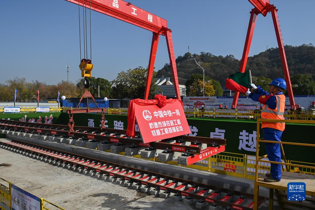 11月28日,在杭州至德清市域鐵路德清高鐵站鋪軌基地,技術(shù)人員指揮龍門(mén)吊將25米軌排吊運至鋪設位置。