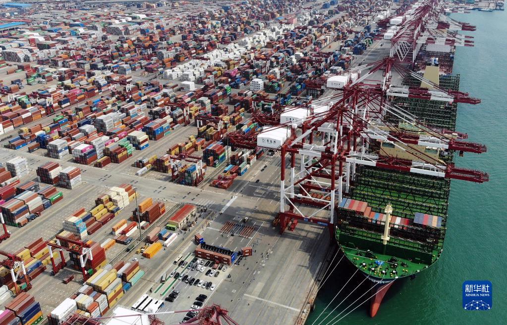 載箱量可達2.4萬(wàn)標準箱的“現代商船阿爾赫西拉斯”輪靠泊在青島港前灣碼頭(2020年4月26日攝,無(wú)人機照片)。新華社記者 李紫恒 攝