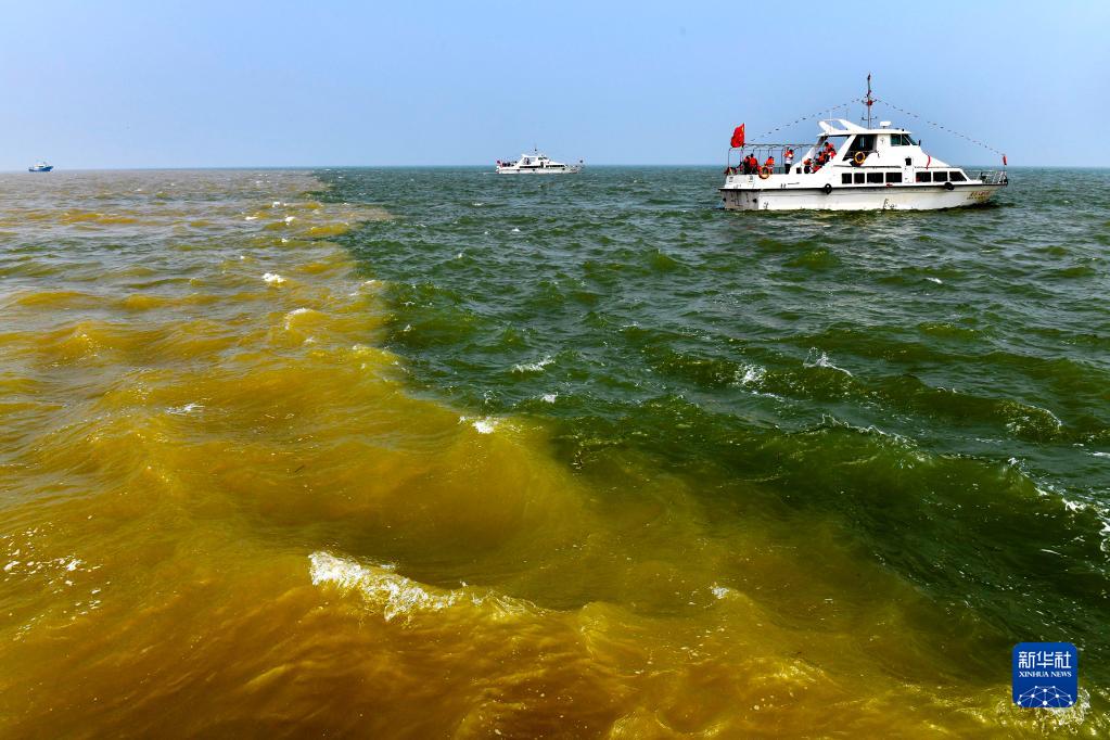 在山東省東營(yíng)市黃河入???,黃河匯入渤海,形成獨特景觀(guān)(5月13日攝)。新華社記者 郭緒雷攝