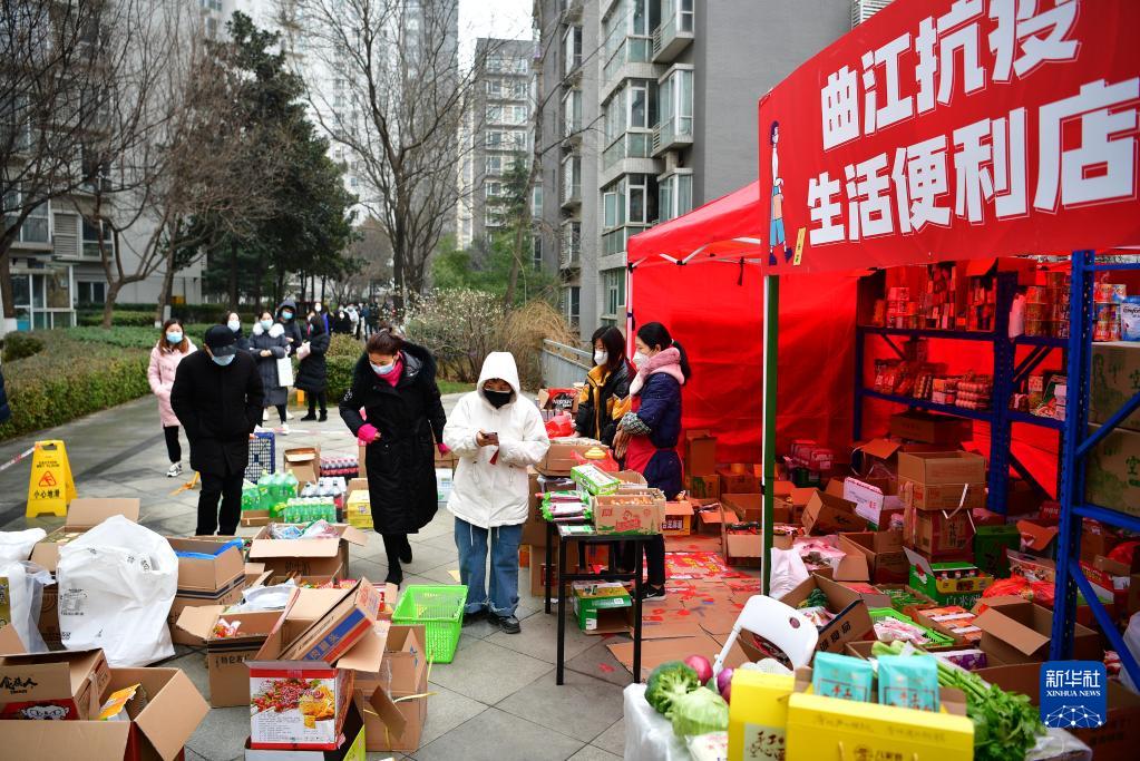 1月7日,居民在西安曲江新區一小區內的生活便利店前排隊購買(mǎi)食品。新華社記者 邵瑞 攝