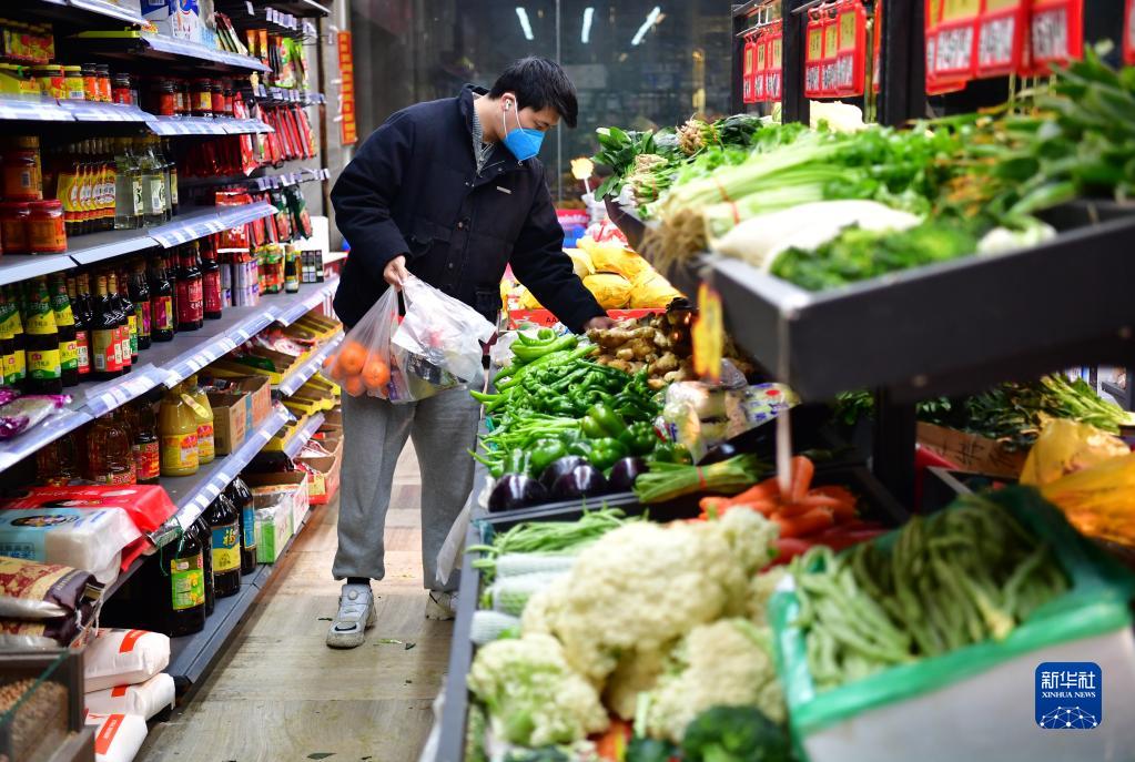 1月7日,西安曲江新區一小區超市內,一名居民在選購菜品。新華社記者 邵瑞 攝