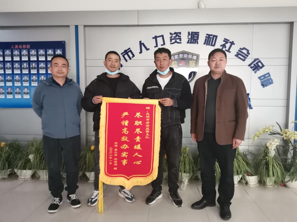 2022年1月10日,兩位農民工向幫助其討薪的昆明市勞動(dòng)監察支隊送來(lái)錦旗。(云南省人力資源和社會(huì )保障廳供圖)