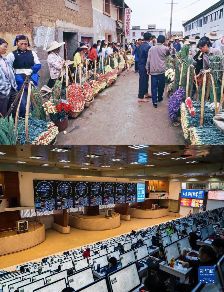 拼版照片:上圖為1994年顧客在斗南村購買(mǎi)鮮花(資料照片);下圖為2022年1月21日,花商在昆明國際花卉拍賣(mài)交易中心內競拍鮮花(新華社記者王冠森攝)。新華社發(fā)