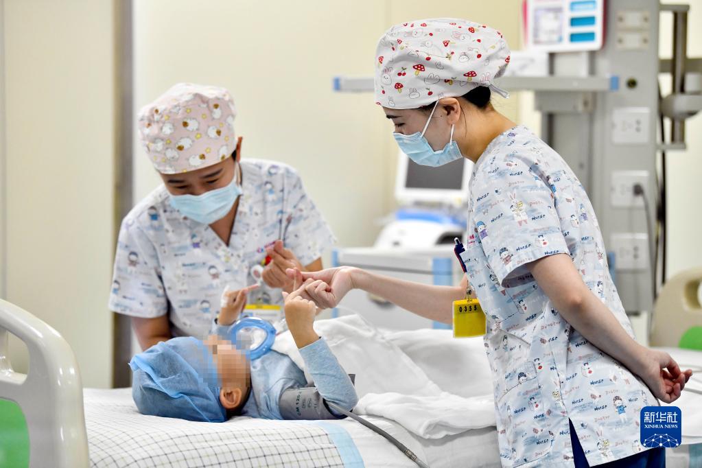 在山東省棗莊市婦幼保健院兒童ICU病房,醫護人員為完成靶向治療藥物諾西那生鈉的4歲脊髓性肌萎縮癥患兒加油鼓勁(2022年1月1日攝)。諾西那生鈉注射液是我國首個(gè)獲批治療脊髓性肌萎縮癥的進(jìn)口藥物,2019年進(jìn)入中國市場(chǎng)時(shí),每針價(jià)格近70萬(wàn)元。在2021年國家醫保目錄藥品談判中,以3.3萬(wàn)元每針的價(jià)格進(jìn)入新版醫保藥品目錄。新華社記者 郭緒雷 攝