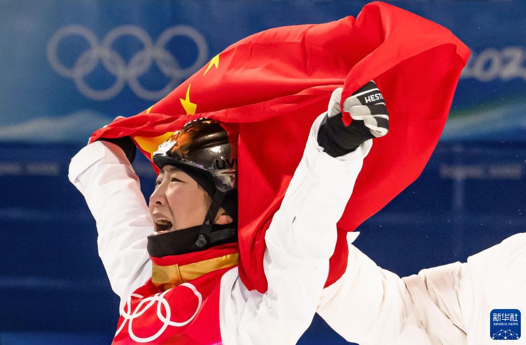 2月14日,中國選手徐夢(mèng)桃在比賽后慶祝。當日,北京2022年冬奧會(huì )自由式滑雪女子空中技巧決賽在張家口云頂滑雪公園舉行,中國選手徐夢(mèng)桃?jiàn)Z得冠軍。新華社記者 肖藝九 攝