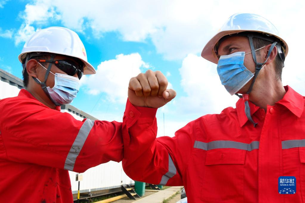2020年11月27日,中國石油集團長(cháng)城鉆探工程公司古巴項目GW91鉆井平臺中方員工(左)同古方員工互相致意。新華社發(fā)(華金·埃爾南德斯攝)
