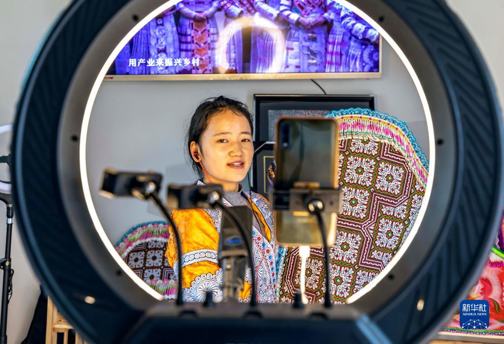 幾千公里外,貴州畢節,“懸崖下的村寨”化屋村里,青春靚麗的“阿哥阿姐”借助電商直播,讓特色苗繡源源不斷飛出深山,走向全國。