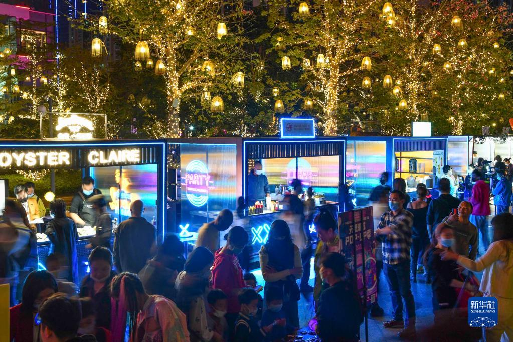 市民在廣州夜經(jīng)濟集聚區天德廣場(chǎng)天德快閃街品嘗美食(2021年12月10日攝)。新華社記者 劉大偉 攝