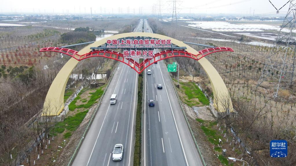 S2滬蘆高速上的中國(上海)自由貿易試驗區臨港新片區“海鷗門(mén)”(2022年2月10日攝,無(wú)人機照片)。新華社記者 方喆 攝