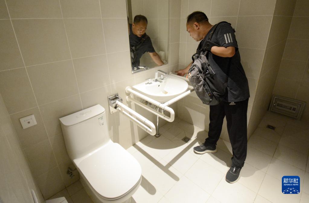 圖為無(wú)障礙專(zhuān)家在北京延慶賽區冬奧村檢查室內衛生間無(wú)障礙設施(2021年7月15日攝)。新華社記者 李欣 攝