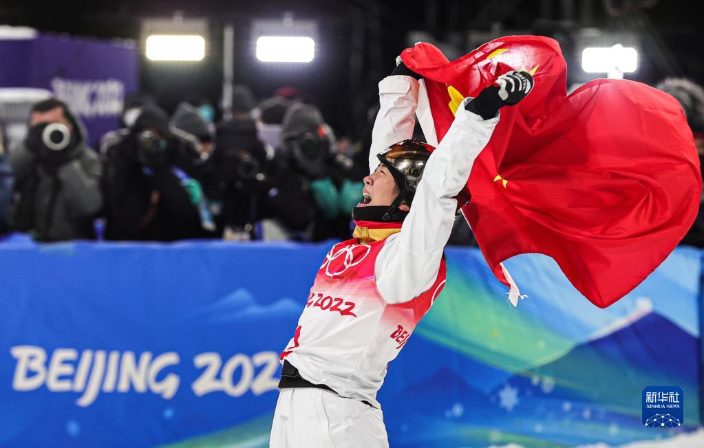 圖為中國選手徐夢(mèng)桃在北京2022年冬奧會(huì )自由式滑雪女子空中技巧決賽后慶祝(2022年2月14日)。新華社記者 吳壯 攝