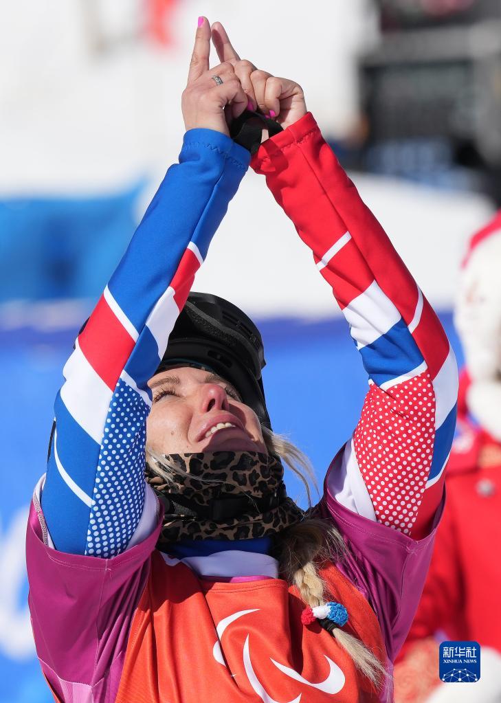 圖為法國選手塞茜爾·埃爾南德斯在北京2022年冬殘奧會(huì )殘奧單板滑雪女子障礙追逐賽后慶祝(2022年3月7日攝)。新華社記者 萬(wàn)象 攝