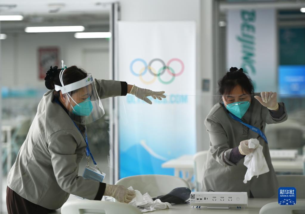 圖為工作人員在北京國家速滑館“冰絲帶”的媒體工作區域消毒(2022年1月28日攝)。新華社記者 武巍 攝