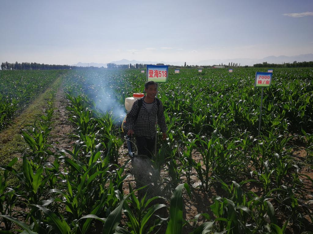 圖為當地農民在玉米拔節期噴施預防玉米紅蜘蛛的藥劑。(受訪(fǎng)單位供圖)