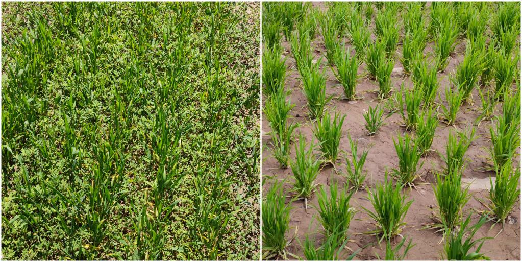 拼版照片:左圖為條播的有機小麥地塊,雜草叢生;右圖為覆膜穴播的有機小麥地塊,幾乎沒(méi)有雜草。(受訪(fǎng)單位供圖)