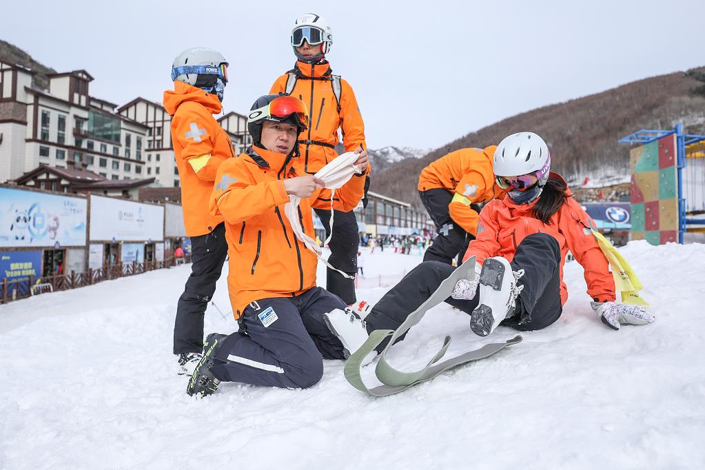 2021年3月13日,由北醫三院醫生組成的國家高山滑雪中心醫療隊在崇禮參加雪地救援培訓。新華社記者張玉薇攝