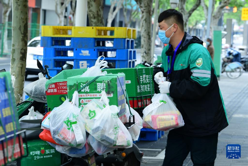 4月30日,在江蘇省太倉市一家生鮮電商配送點(diǎn),配送小哥在整理當天準備配送的生鮮訂單。新華社發(fā)(計海新 攝)