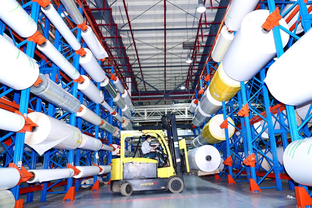 艾利丹尼森(中國)有限公司車(chē)間里,工人正在裝卸產(chǎn)品。(昆山市融媒體中心供圖)