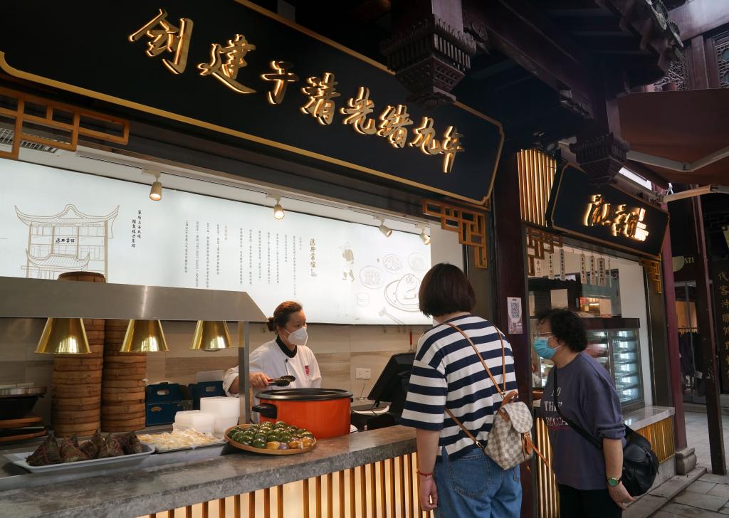6月3日,上海市民在豫園老字號德興菜館的外帶窗口購買(mǎi)粽子。(新華社記者劉穎 攝)