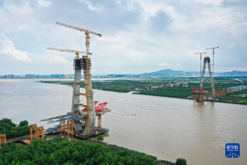 中鐵大橋局建設的南(廣州南沙)中(中山)高速公路洪奇門(mén)特大橋主橋開(kāi)始架設鋼箱梁(6月15日攝,無(wú)人機照片)。新華社記者劉大偉攝