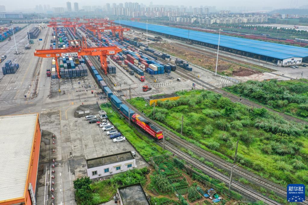 滿(mǎn)載著(zhù)電子產(chǎn)品、機械零件、日用百貨等貨物的中歐班列(重慶)第10000列列車(chē)從重慶團結村中心站駛出(2022年6月23日攝,無(wú)人機照片)。新華社記者 黃偉 攝