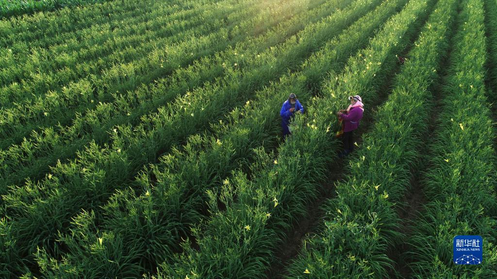 農戶(hù)在寧夏吳忠市紅寺堡區柳泉鄉黃花菜基地采摘黃花菜(2022年7月5日攝,無(wú)人機照片)。新華社記者 王鵬 攝