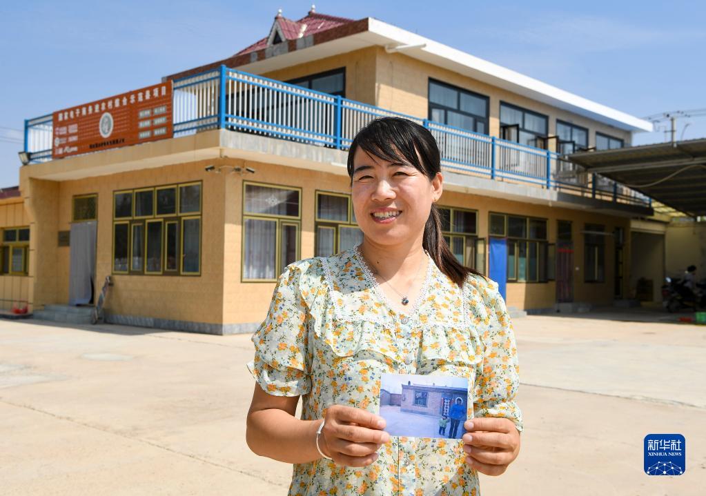 2022年8月4日,寧夏吳忠市紅寺堡區新莊集鄉白墩村村民王航弟在自家二層樓房前。她手里拿著(zhù)的是10多年前住房的照片。新華社記者 馮開(kāi)華 攝