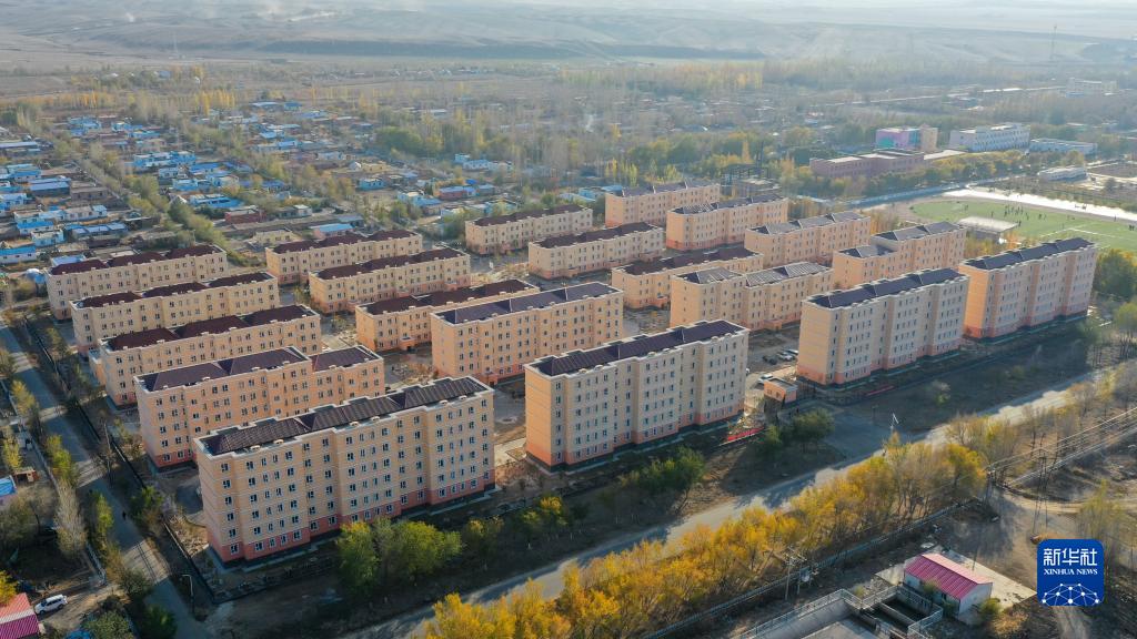 這是新疆昌吉市阿什里鄉天鵝小鎮(無(wú)人機照片,2020年10月16日攝)。天鵝小鎮是由福建援疆泉州分指揮部支援建設的牧民定居項目。新華社記者 丁磊 攝