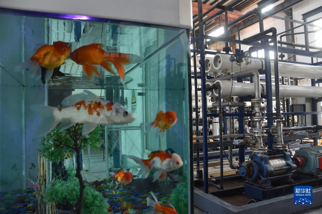 湖南省衡陽(yáng)市水口山一家鉛冶煉廠(chǎng)內放置了一個(gè)魚(yú)缸,里面養了多條金魚(yú)(2022年3月10日攝)。魚(yú)缸里的水,正是經(jīng)膜處理后的工業(yè)廢水。新華社記者 白田田 攝