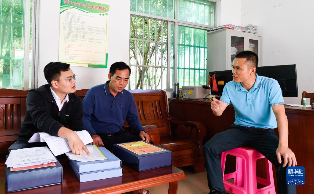 在海南省瓊中黎族苗族自治縣灣嶺鎮加章村委會(huì ),紀檢監察干部(左一)在查閱鄉村振興及村級財務(wù)支出相關(guān)材料(2021年11月13日攝)。新華社記者 楊冠宇 攝