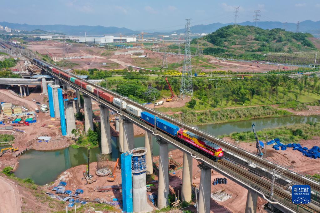中緬新通道(重慶—臨滄—緬甸)國際鐵路班列從重慶果園港魚(yú)嘴車(chē)站順利發(fā)車(chē)(無(wú)人機照片,2022年5月23日攝)。新華社記者 唐奕 攝
