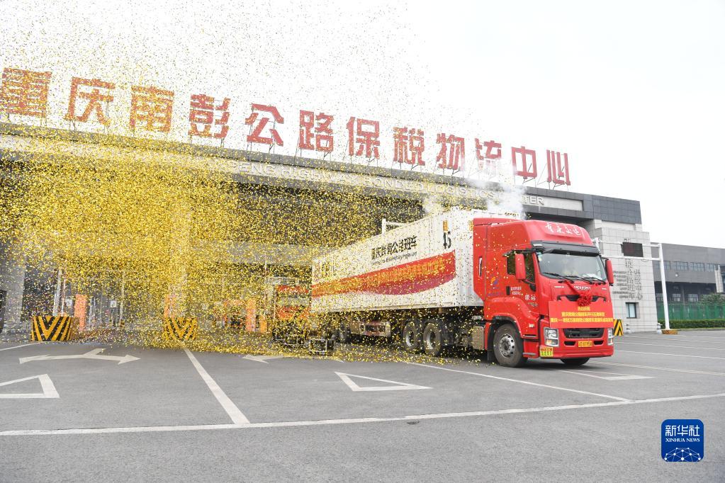 重慶至老撾萬(wàn)象跨境公路班車(chē)直通車(chē)從重慶南彭公路保稅物流中心駛出(2021年4月28日攝)。新華社記者 唐奕 攝