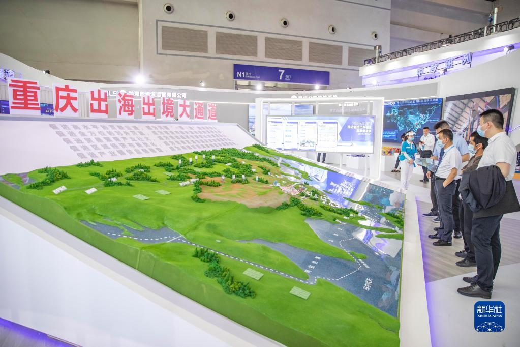 觀(guān)眾在第三屆中國西部國際投資貿易洽談會(huì )上參觀(guān)重慶出海出境大通道沙盤(pán)(2021年5月21日攝)。新華社記者 黃偉 攝