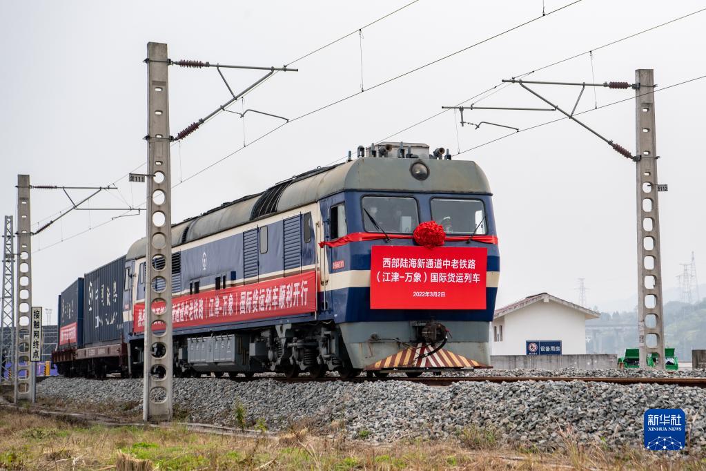 中老鐵路(江津—萬(wàn)象)國際貨運首發(fā)列車(chē)從小南埡鐵路物流中心駛出(2022年3月2日攝)。新華社記者 唐奕 攝