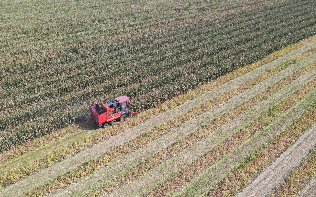 9月22日,玉米收割機將收獲的玉米倒入小四輪拖拉機車(chē)斗內。新華社記者張浩然 攝