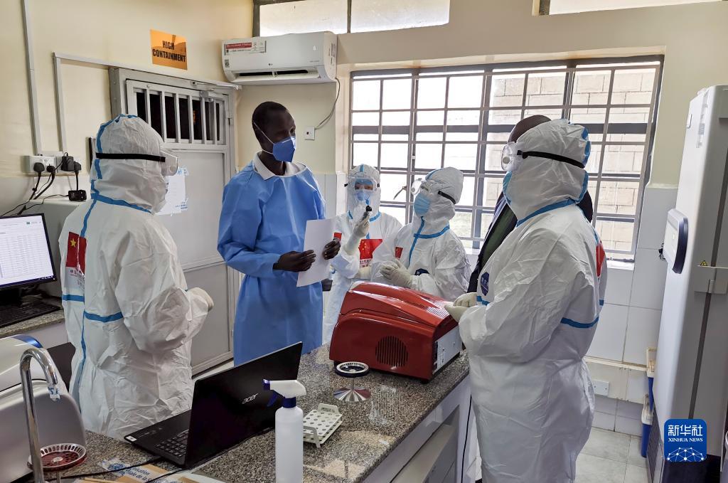 2020年8月21日,在南蘇丹首都朱巴的一處新冠病毒檢測機構,中國抗疫醫療專(zhuān)家組成員與當地醫護人員交流。新華社發(fā)(中國駐南蘇丹大使館供圖)