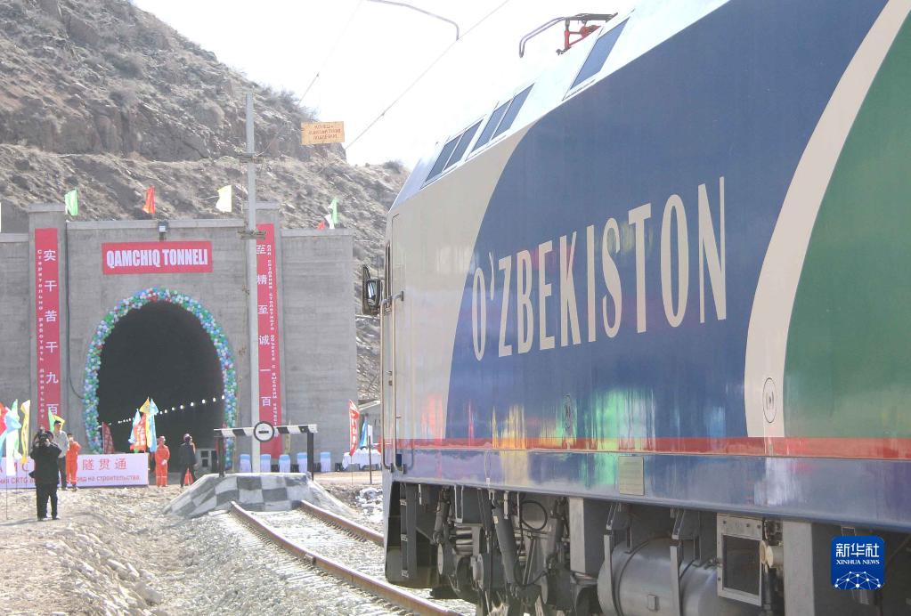 2016年2月27日,一列專(zhuān)列停在烏茲別克斯坦安格連-帕普鐵路卡姆奇克隧道進(jìn)口。新華社記者 沙達提 攝