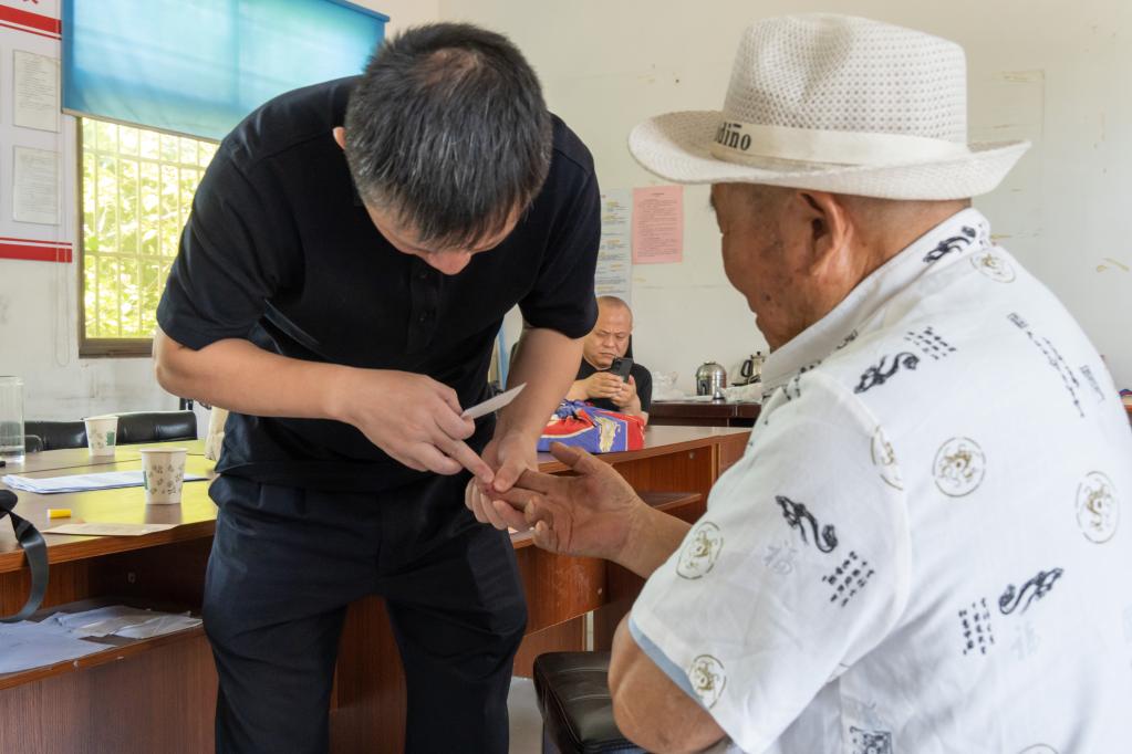 圖為柯偉力在給劉金山采集血樣,用于比對DNA。(受訪(fǎng)者供圖)