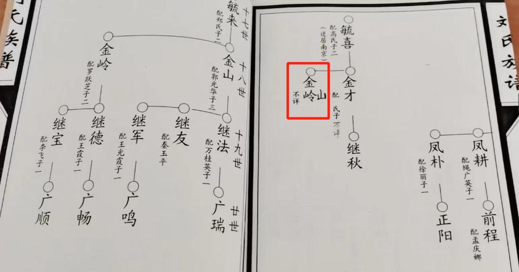 圖為劉氏族譜,其中紅框部分為1945年犧牲的烈士劉金山,由于該支長(cháng)期失聯(lián),且族中老人記憶模糊,在修族譜時(shí),以劉金嶺之名入譜。(受訪(fǎng)者供圖)