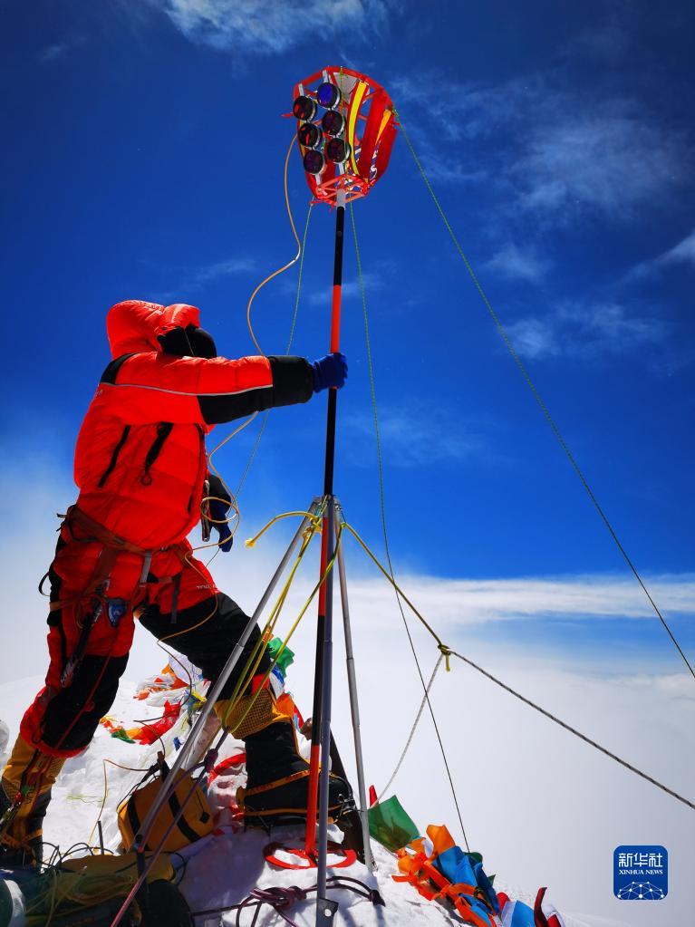 2020珠峰高程測量登山隊隊員在珠穆朗瑪峰峰頂開(kāi)展測量工作(2020年5月27日攝)。新華社特約記者 扎西次仁 攝