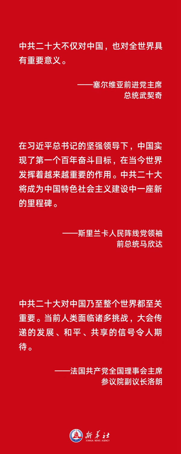 斯里蘭卡人民陣線(xiàn)黨領(lǐng)袖、前總統馬欣達表示,在習近平總書(shū)記的堅強領(lǐng)導下,中國實(shí)現了第一個(gè)百年奮斗目標,在當今世界發(fā)揮著(zhù)越來(lái)越重要的作用。中共二十大將成為中國特色社會(huì )主義建設中一座新的里程碑。