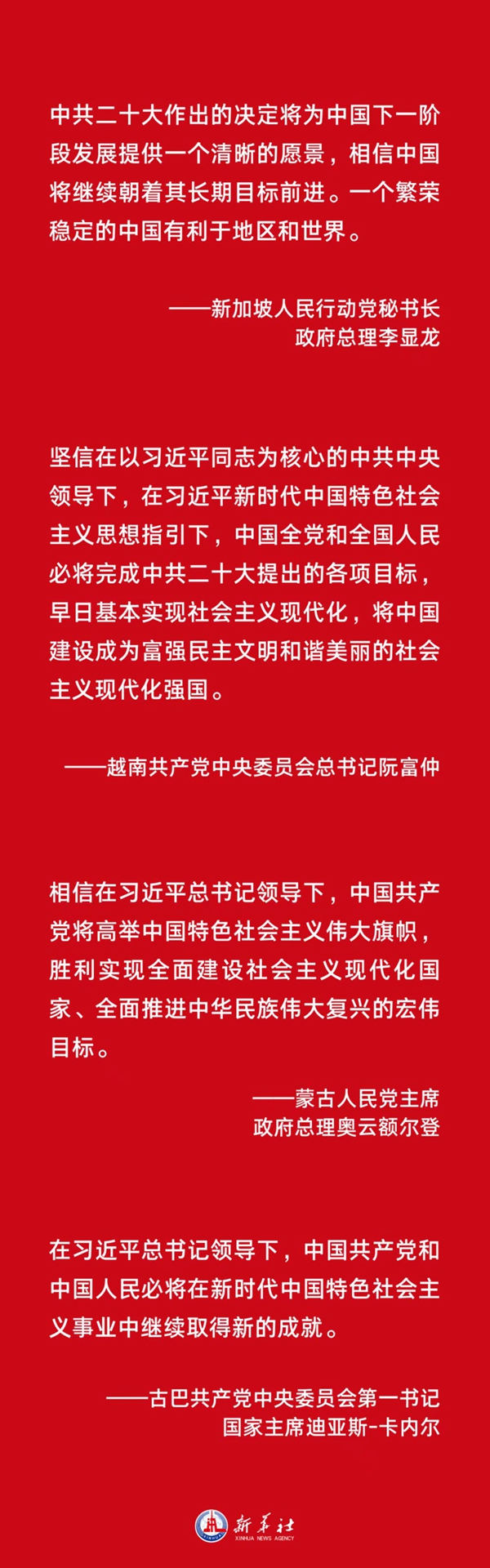 中共二十大回顧總結了過(guò)去五年的工作和新時(shí)代十年的偉大變革,描繪了以中國式現代化全面推進(jìn)中華民族偉大復興的宏偉藍圖。各國政黨政要通過(guò)賀電賀函表達他們對中國的未來(lái)充滿(mǎn)信心,堅信中共必將團結帶領(lǐng)中國人民不斷譜寫(xiě)新時(shí)代中國特色社會(huì )主義新篇章。