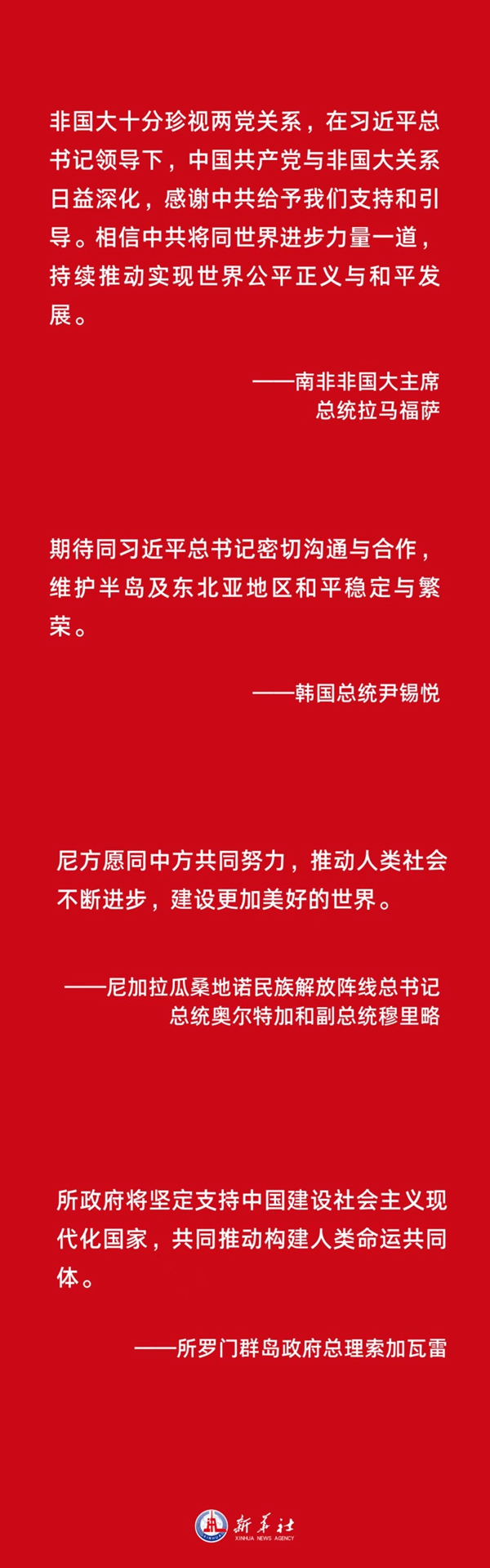 南非非國大主席、總統拉馬福薩表示,非國大十分珍視兩黨關(guān)系,在習近平總書(shū)記領(lǐng)導下,中國共產(chǎn)黨與非國大關(guān)系日益深化,感謝中共給予我們支持和引導。相信中共將同世界進(jìn)步力量一道,持續推動(dòng)實(shí)現世界公平正義與和平發(fā)展。