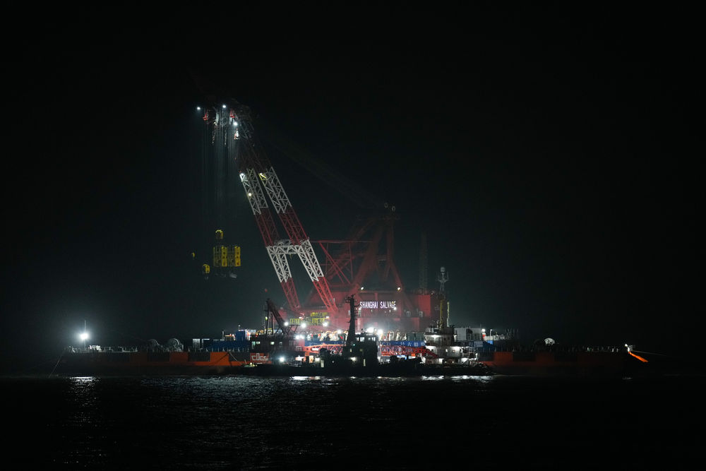 11月20日晚八點(diǎn)半左右拍攝的長(cháng)江口二號古船整體打撈現場(chǎng)。
