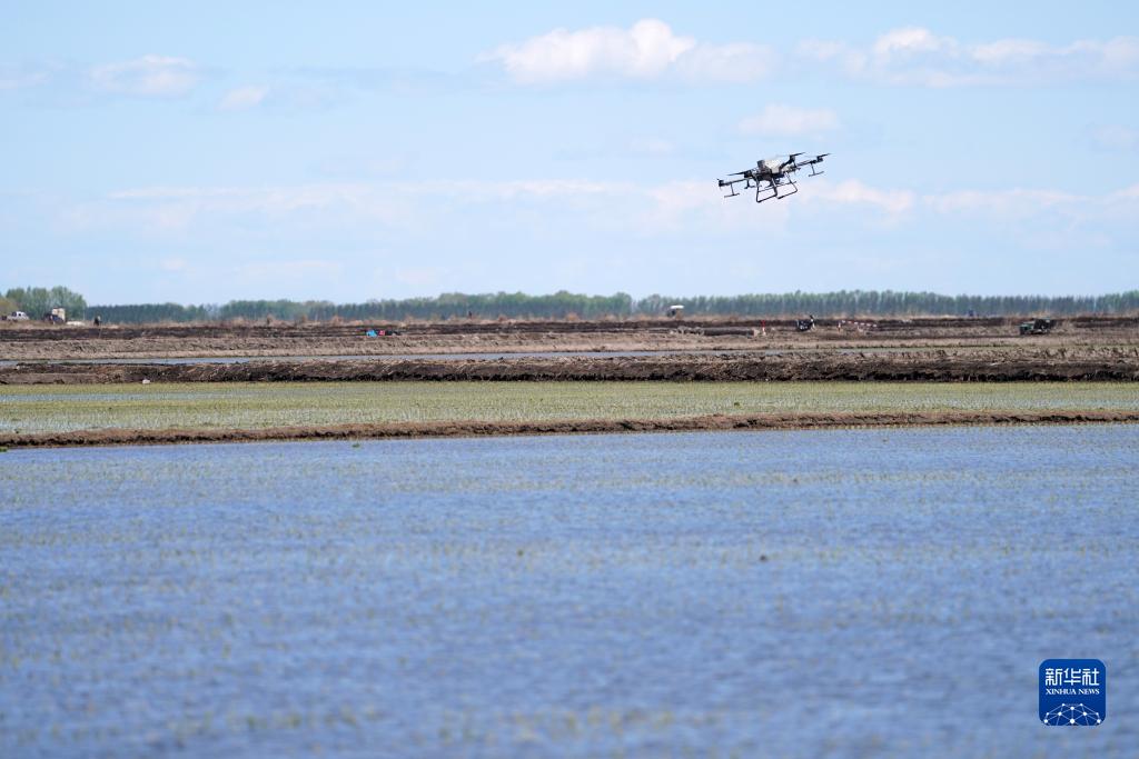 無(wú)人機在北大荒集團七星農場(chǎng)有限公司一塊稻田中作業(yè)(2022年5月18日攝)。 新華社記者 王建威 攝